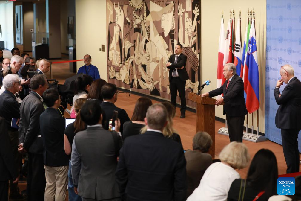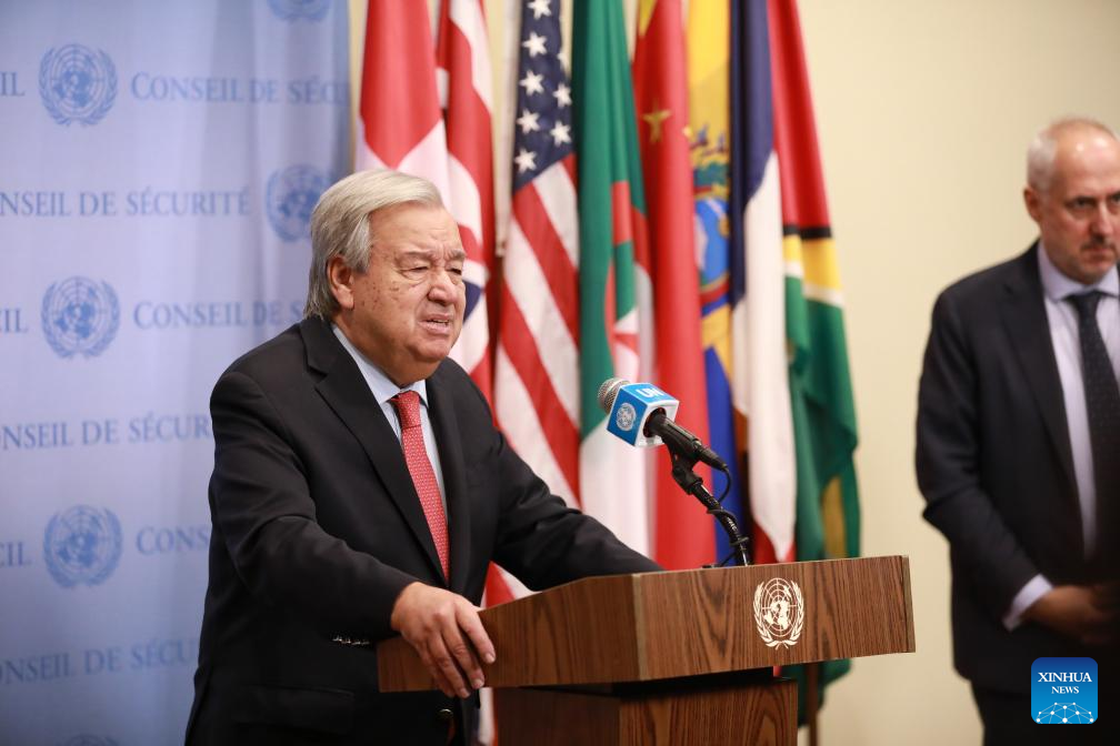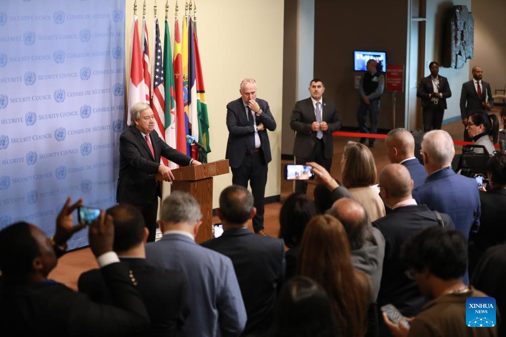 UN Secretary-General Antonio Guterres (at the podium) speaks to the press outside the Security Council Chamber at the UN headquarters in New York, on Oct. 8, 2024. Guterres on Tuesday expressed "profound concern" over Israel's draft legislation that could prevent UNRWA, the UN relief agency for Palestinians, from continuing its essential work in the Occupied Palestinian Territory. (Xinhua/Xie E)