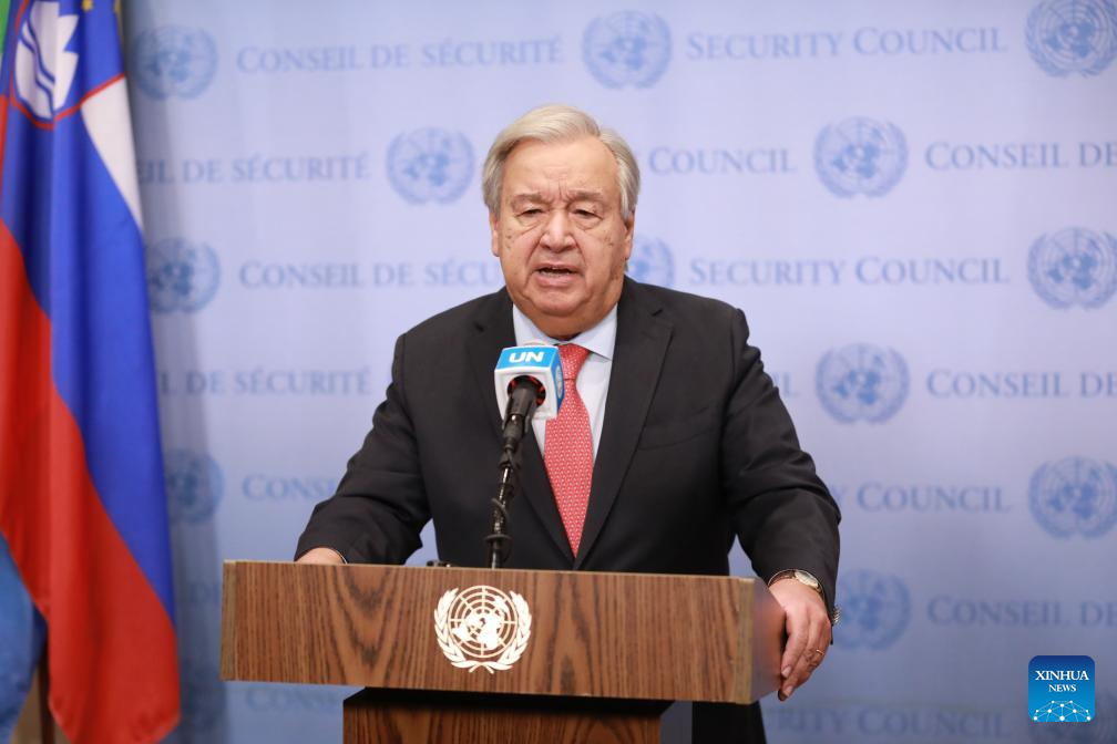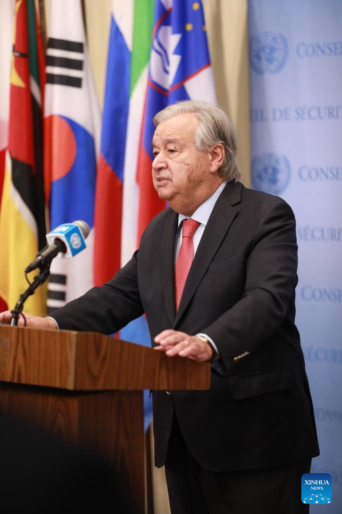 UN Secretary-General Antonio Guterres speaks to the press outside the Security Council Chamber at the UN headquarters in New York, on Oct. 8, 2024. Guterres on Tuesday expressed "profound concern" over Israel's draft legislation that could prevent UNRWA, the UN relief agency for Palestinians, from continuing its essential work in the Occupied Palestinian Territory. (Xinhua/Xie E)