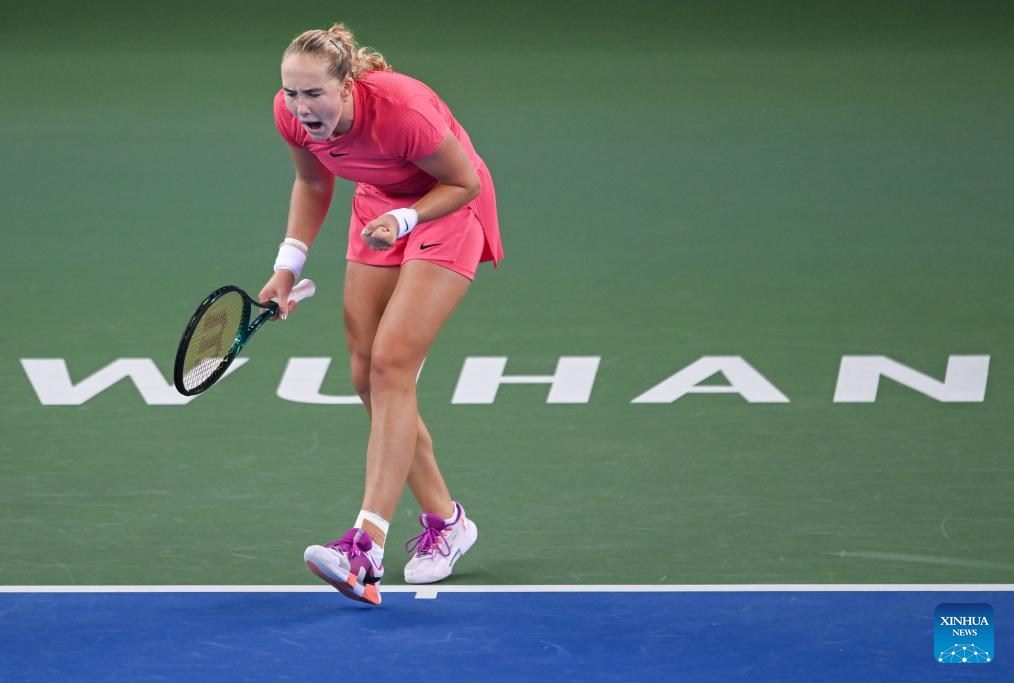 Andreeva Mirra of Russia celebrates during the women's singles round of 64 match against Wang Xiyu of China at the 2024 Wuhan Open tennis tournament in Wuhan, capital of central China's Hubei Province, Oct. 8, 2024. (Xinhua/Wu Zhizun)