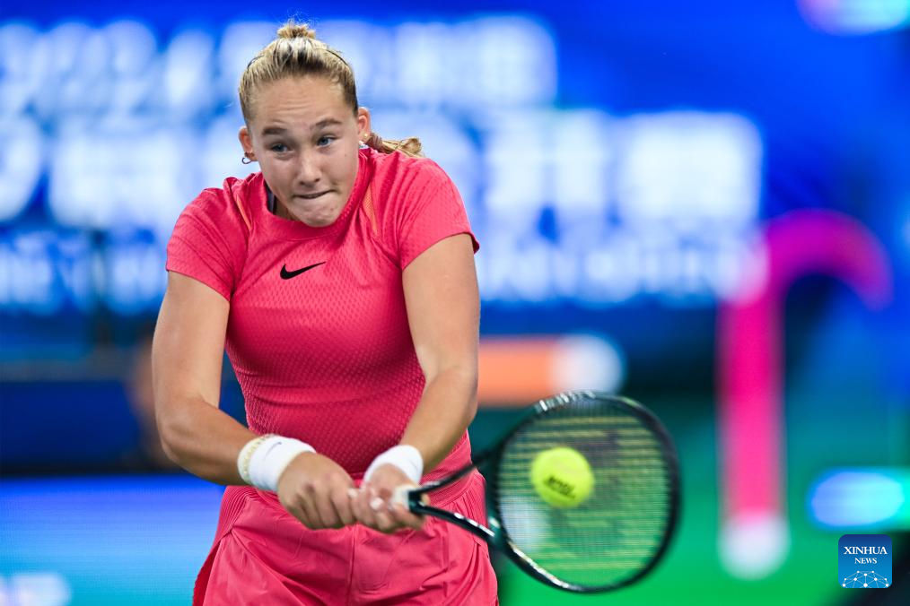Andreeva Mirra of Russia hits a return during the women's singles round of 64 match against Wang Xiyu of China at the 2024 Wuhan Open tennis tournament in Wuhan, capital of central China's Hubei Province, Oct. 8, 2024. (Xinhua/Wu Zhizun)
