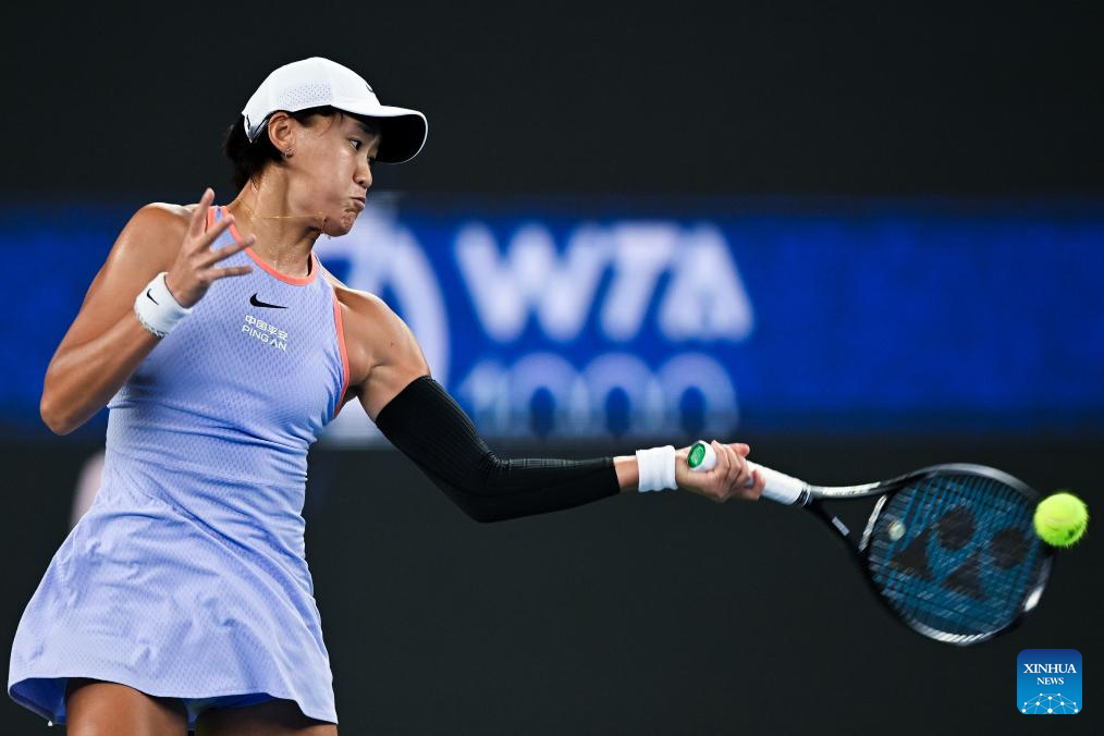 Wang Xiyu of China hits a return during the women's singles round of 64 match against Andreeva Mirra of Russia at the 2024 Wuhan Open tennis tournament in Wuhan, capital of central China's Hubei Province, Oct. 8, 2024. (Xinhua/Wu Zhizun)