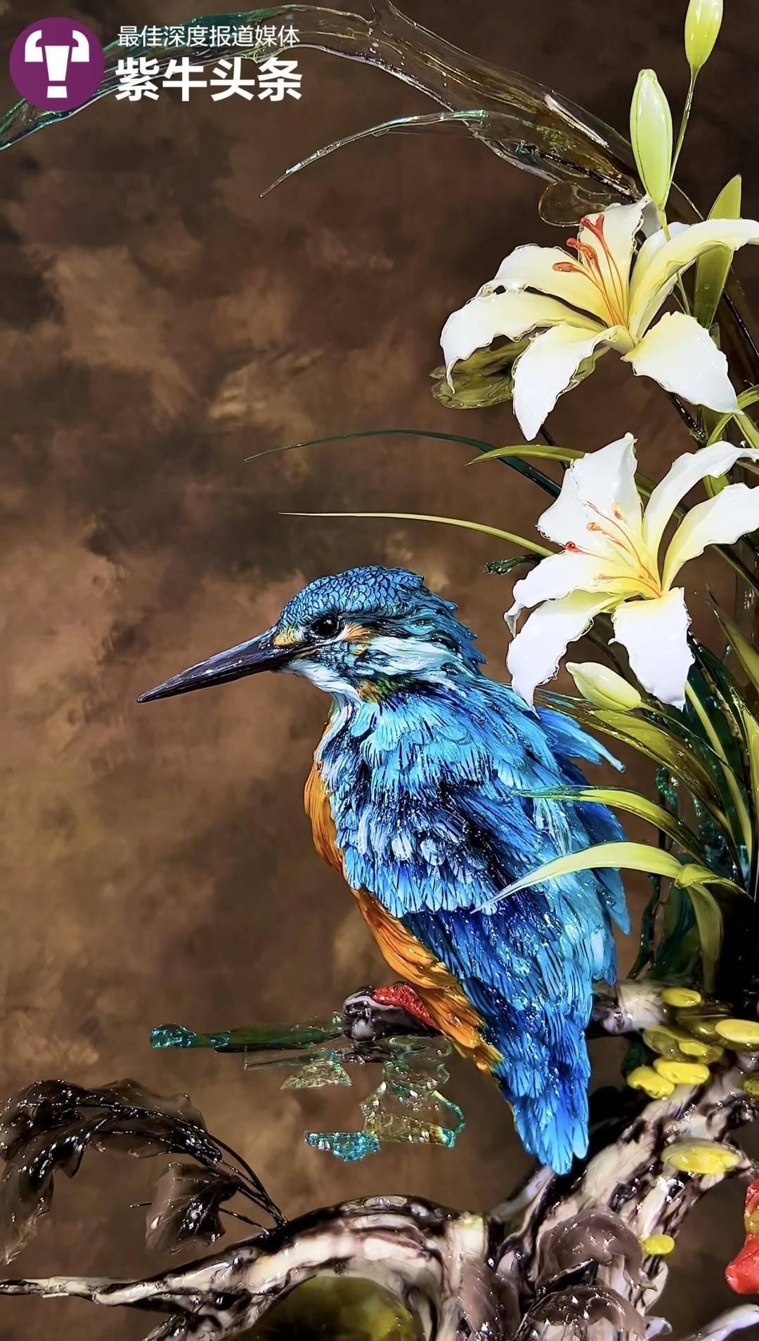 Each of the art pieces is lifelike and exquisite. One of the artworks in the shape of a kingfisher, for instance, is so intricately carved that even the fine down on its bright blue feathers on the back is clearly visible.