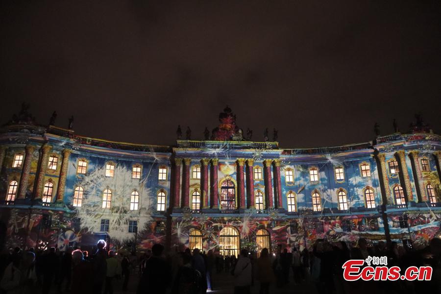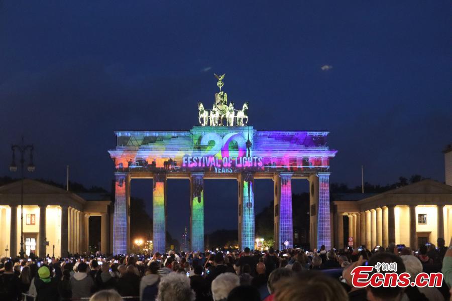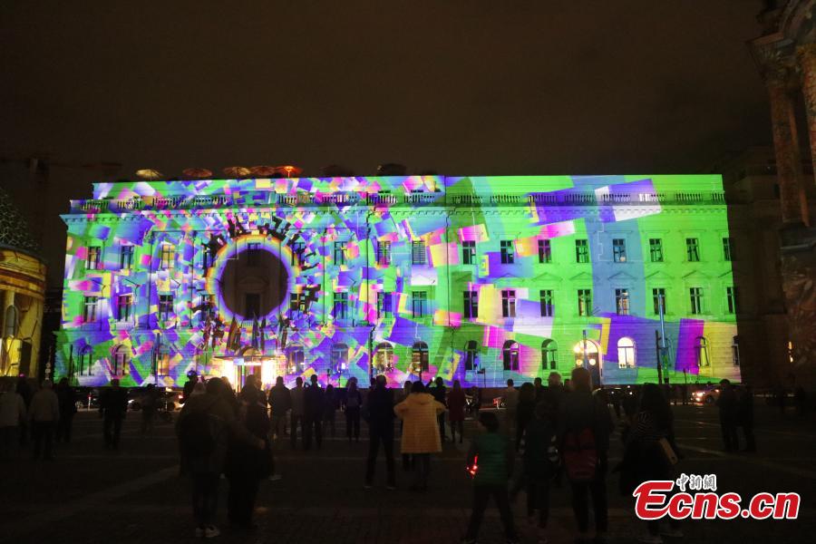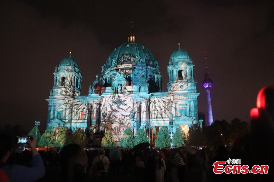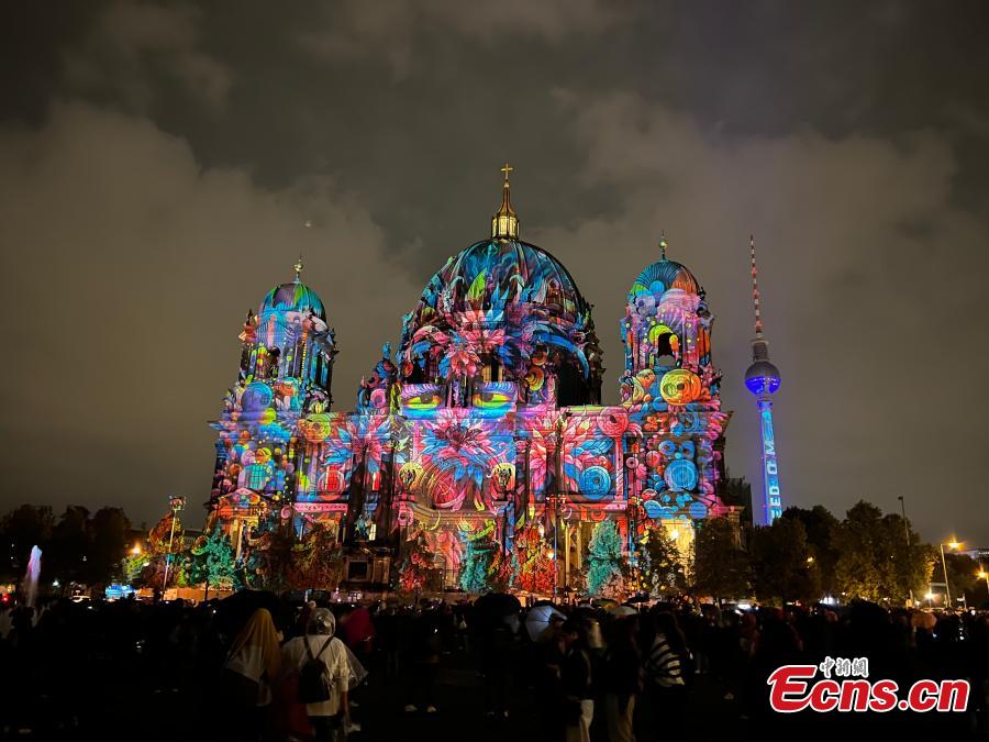 A landmark building is illuminated during the 2024 Festival of Lights in Berlin, Germany, Oct. 8, 2024. (Photo: China News Service/Ma Xiuxiu)