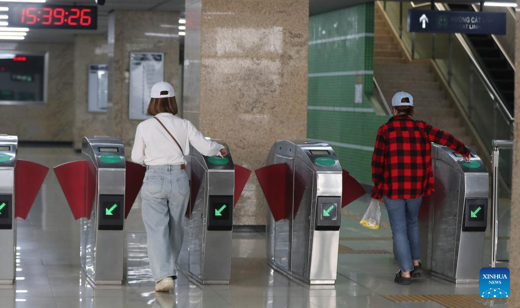 Citizens enter a station of the Cat Linh-Ha Dong urban elevated railway in Hanoi, Vietnam, Oct. 9, 2024. The Cat Linh-Ha Dong urban elevated railway was built by the China Railway Sixth Group as an important project of the synergy of China's Belt and Road Initiative with Vietnam's "Two Corridors and One Economic Circle" plan. (Xinhua/Yao Qilin)
