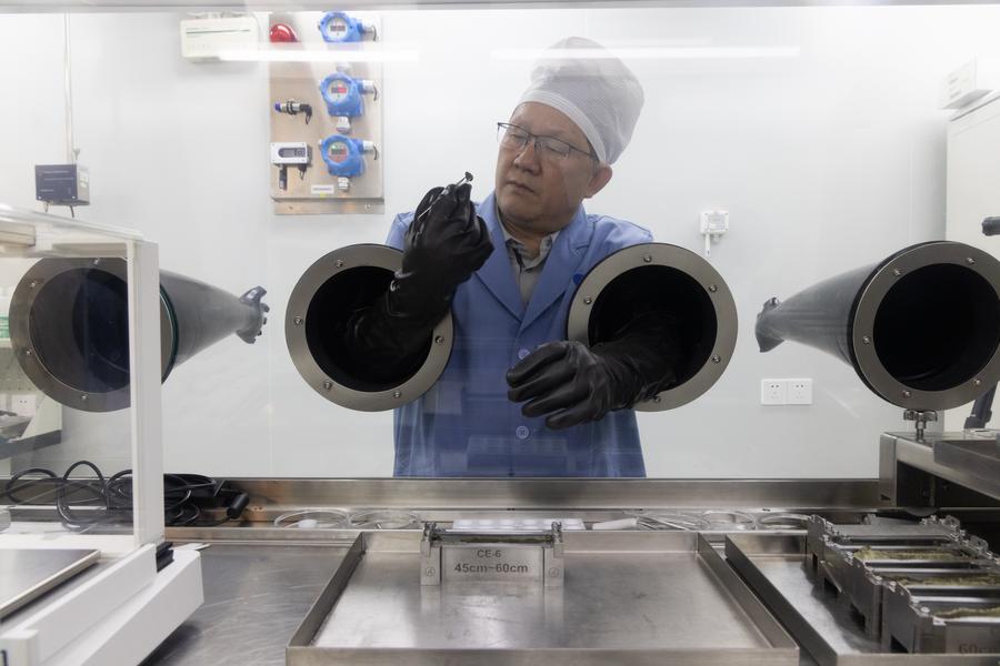 Li Chunlai, a researcher with the National Astronomical Observatories of the Chinese Academy of Sciences (CAS) and deputy chief designer of the Chang'e-6 mission, deals with lunar samples retrieved by the Chang'e-6 mission at the lunar sample laboratory in Beijing, capital of China, Sept. 24, 2024. (Xinhua/Jin Liwang)