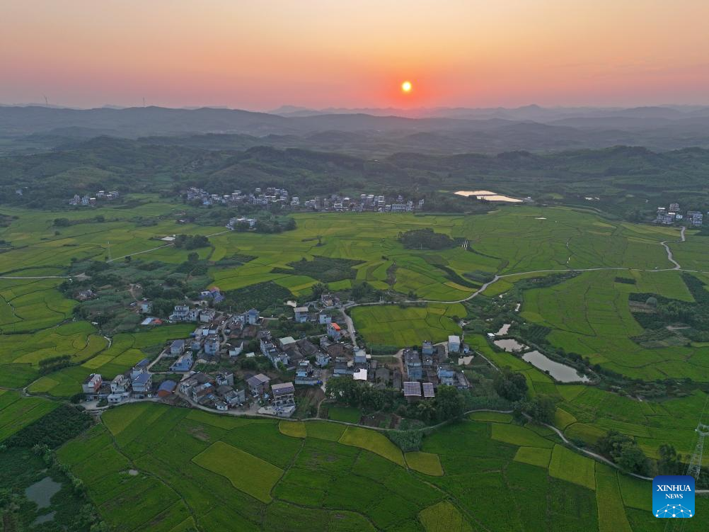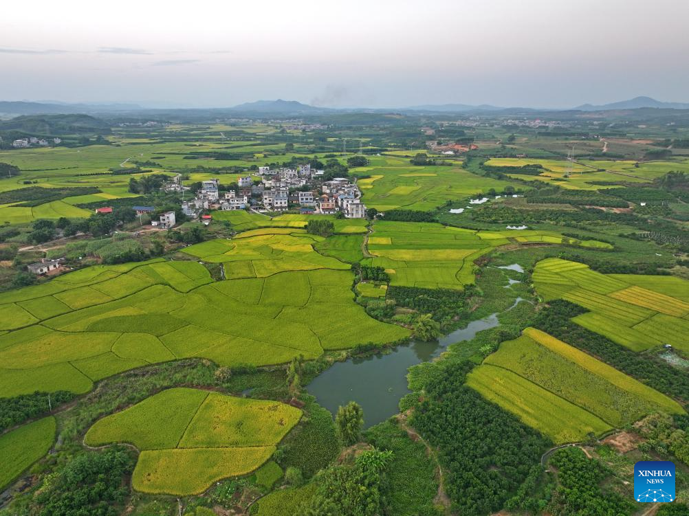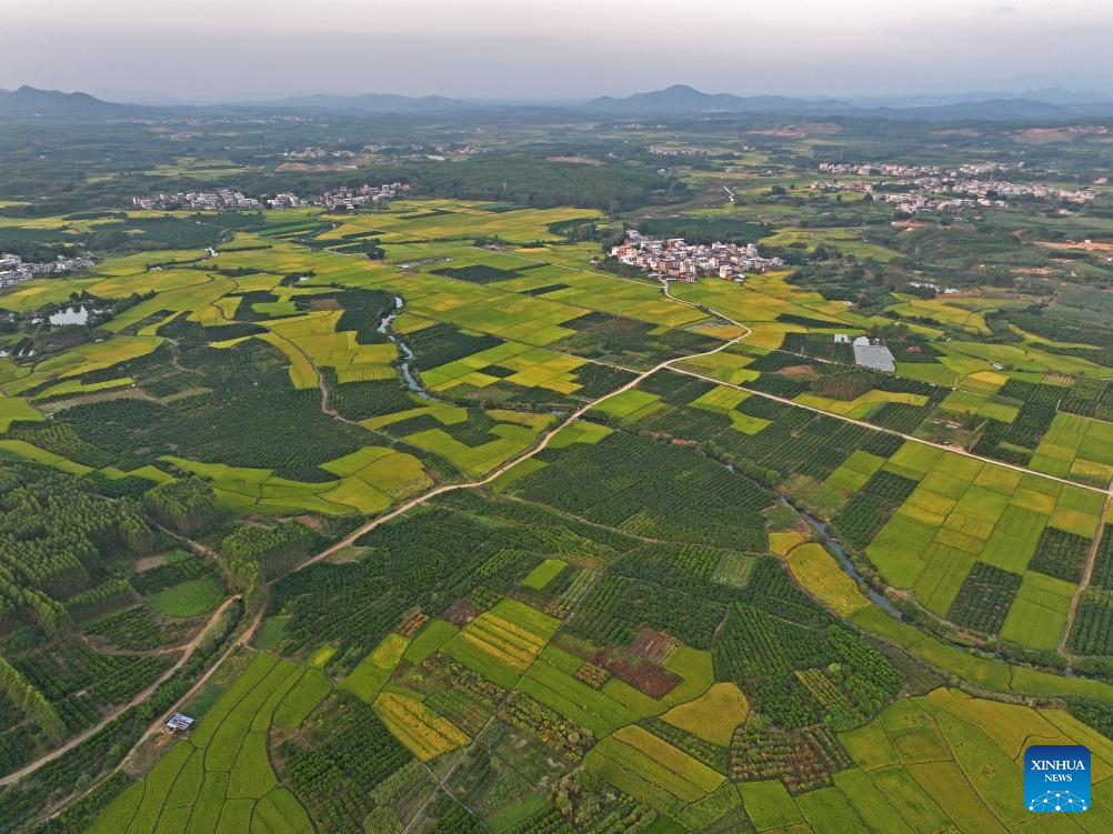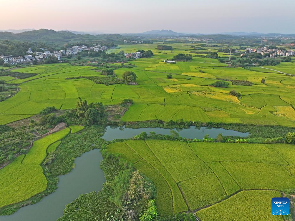 An aerial drone photo taken on Oct. 10, 2024 shows fields in Sicun Town of Xiangzhou County in Laibin City, south China's Guangxi Zhuang Autonomous Region. As a key grain production base in Guangxi, Xiangzhou County's grain sown area reached over 460,000 mu (about 30,667 hectares) in 2024, and the grain output is expected to surpass 160,000 tonnes. (Xinhua/Zhou Hua)