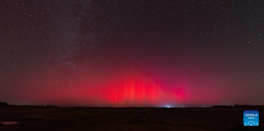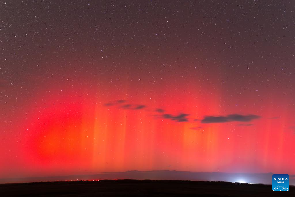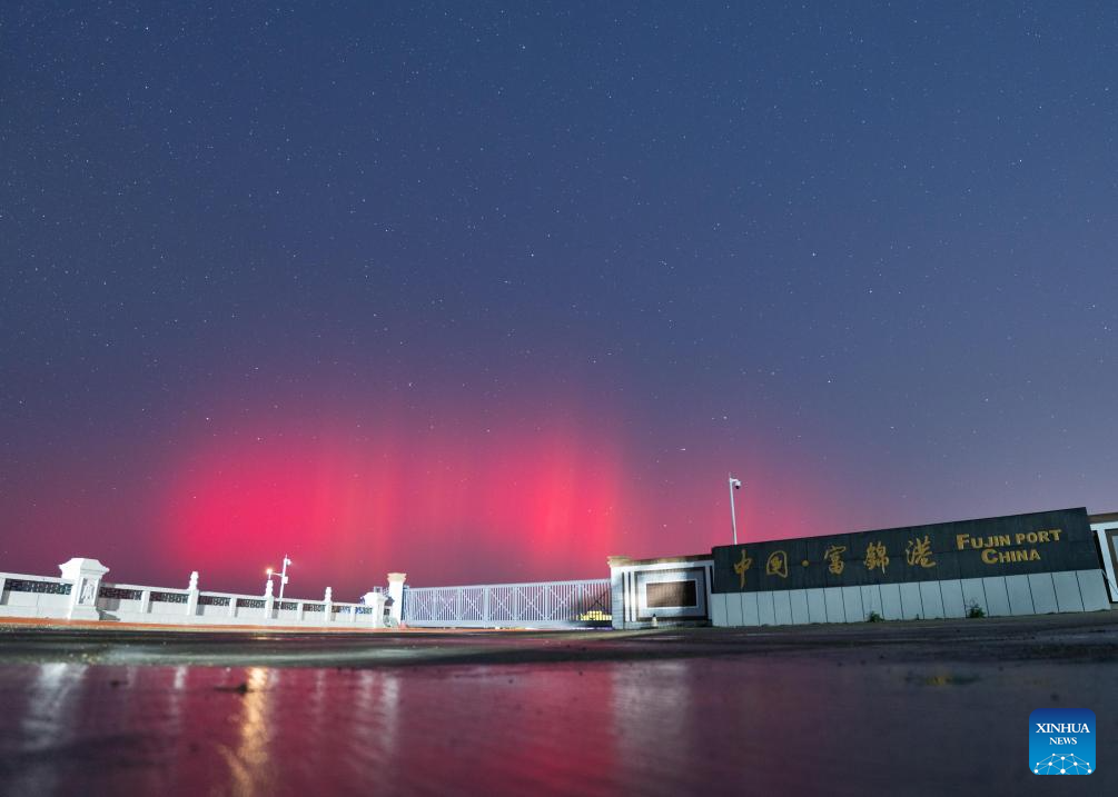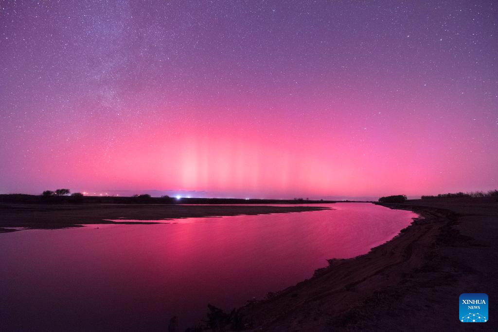 This photo taken on Oct. 11, 2024 shows the northern lights over Mudanjiang City, northeast China's Heilongjiang Province. Northern lights were observed at different places across Heilongjiang in the early morning on Friday. (Photo by Wang Baoxun/Xinhua)