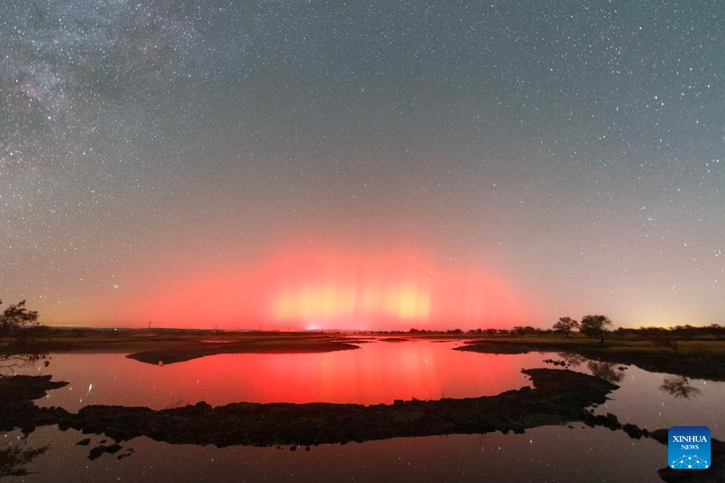 This photo taken on Oct. 11, 2024 shows the northern lights over a wetland in Harbin City, northeast China's Heilongjiang Province. Northern lights were observed at different places across Heilongjiang in the early morning on Friday. (Photo by Liu Dapeng/Xinhua)