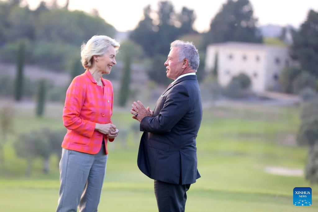 King Abdullah II (R) of Jordan talks with European Commission President Ursula von der Leyen during the Med9 Summit in Paphos, Cyprus, on Oct. 11, 2024. The leaders of the nine Mediterranean European Union (EU) countries, known as Med9, called for an immediate ceasefire in the Middle East and urged a resumption of diplomatic efforts to address the region's ongoing conflicts during their summit on Friday. (Photo by George Christophorou/Xinhua)