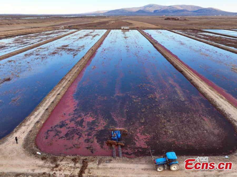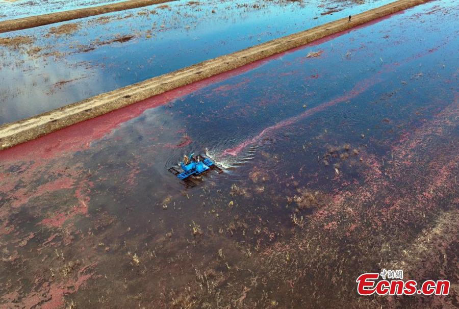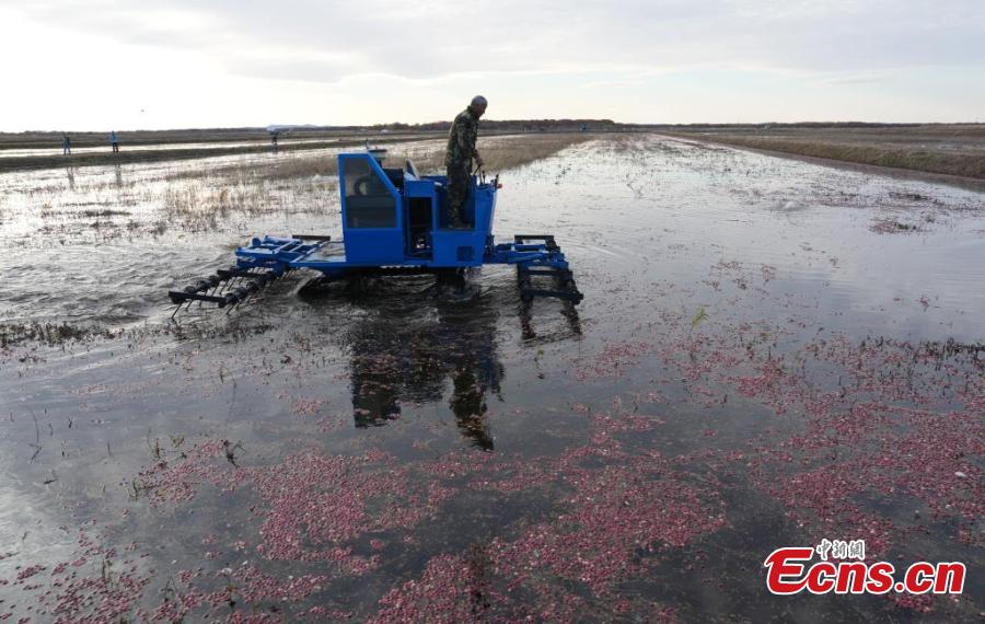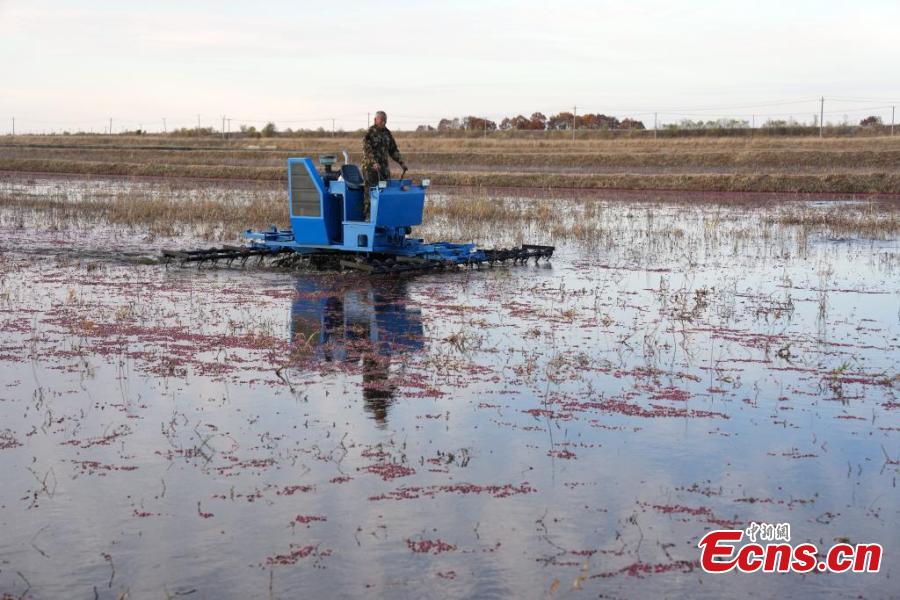 A harvester works at a cranberry field in Fuyuan, northeast China's Heilongjiang Province, Oct. 11, 2024. (Photo: China News Service/Mao Jianjun)