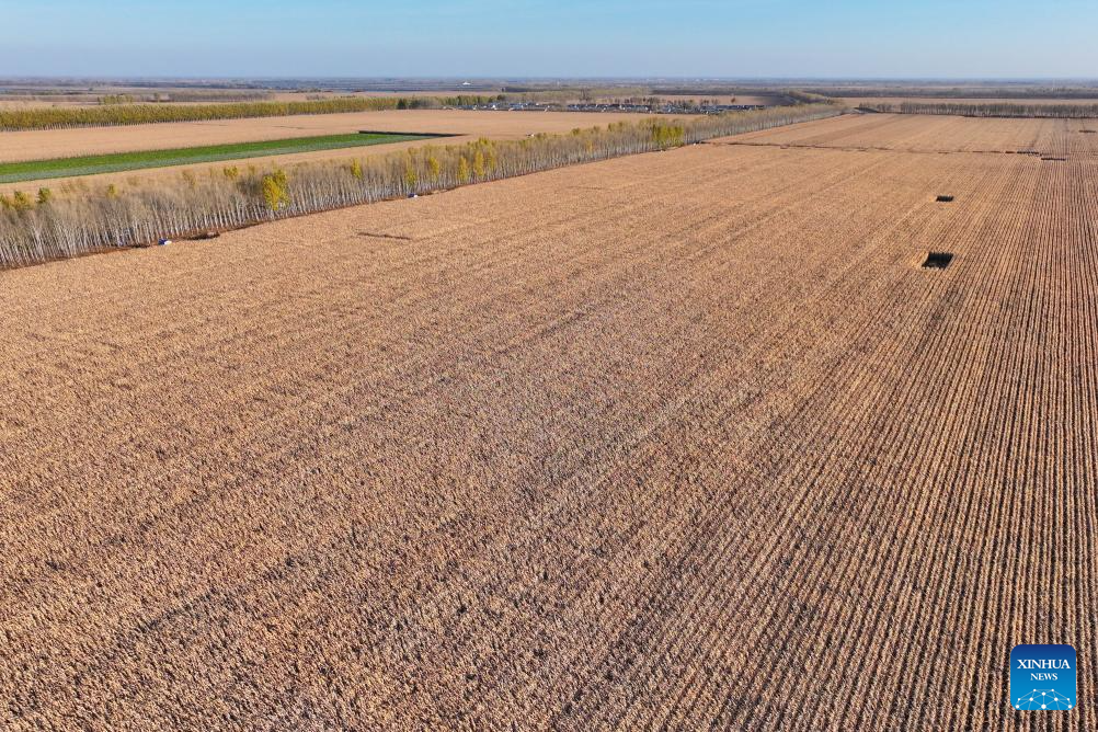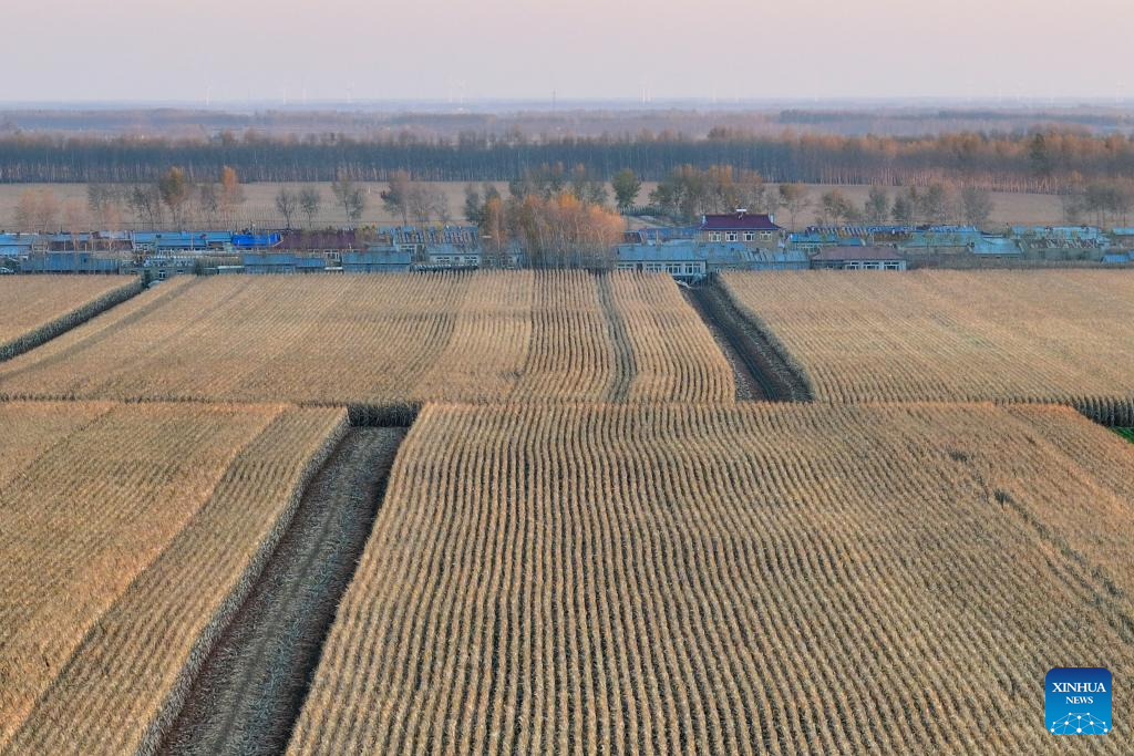 A panoramic drone photo taken on Oct. 11, 2024 shows corn fields in Dongsheng Village, Zhaodong City of northeast China's Heilongjiang Province. (Xinhua/Wang Jianhua)