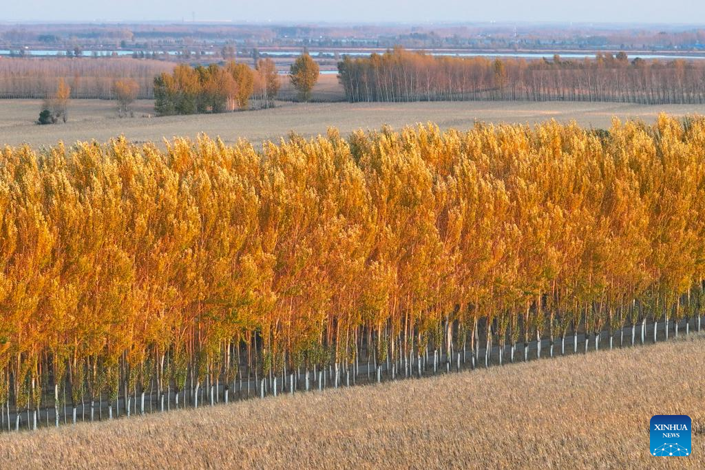 A drone photo taken on Oct. 11, 2024 shows fields and trees in Dongsheng Village, Zhaodong City of northeast China's Heilongjiang Province. (Xinhua/Wang Jianhua)
