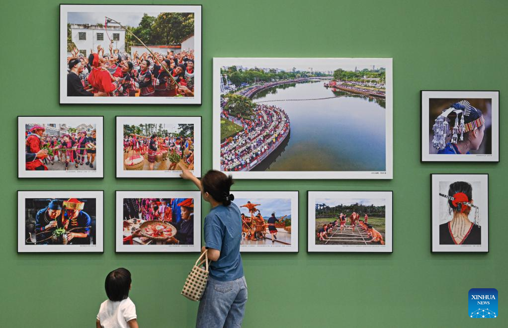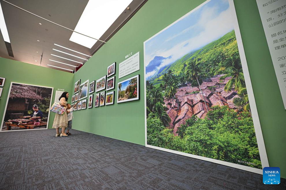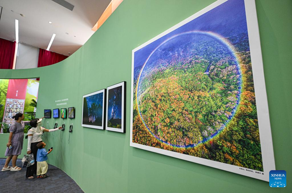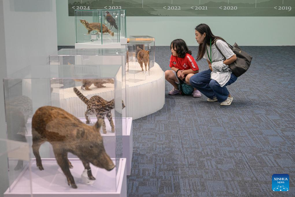 People visit the "Guarding Rainforest Homeland" exhibition in Haikou, south China's Hainan Province, Oct. 13, 2024. The "Guarding Rainforest Homeland" exhibition has been held by the management office of the National Park of Hainan Tropical Rainforest in Haikou. Featuring animal specimens, photographs and videos, the exhibition showcases the beauty of rainforest and introduces the construction process of the National Park of Hainan Tropical Rainforest. (Xinhua/Pu Xiaoxu)