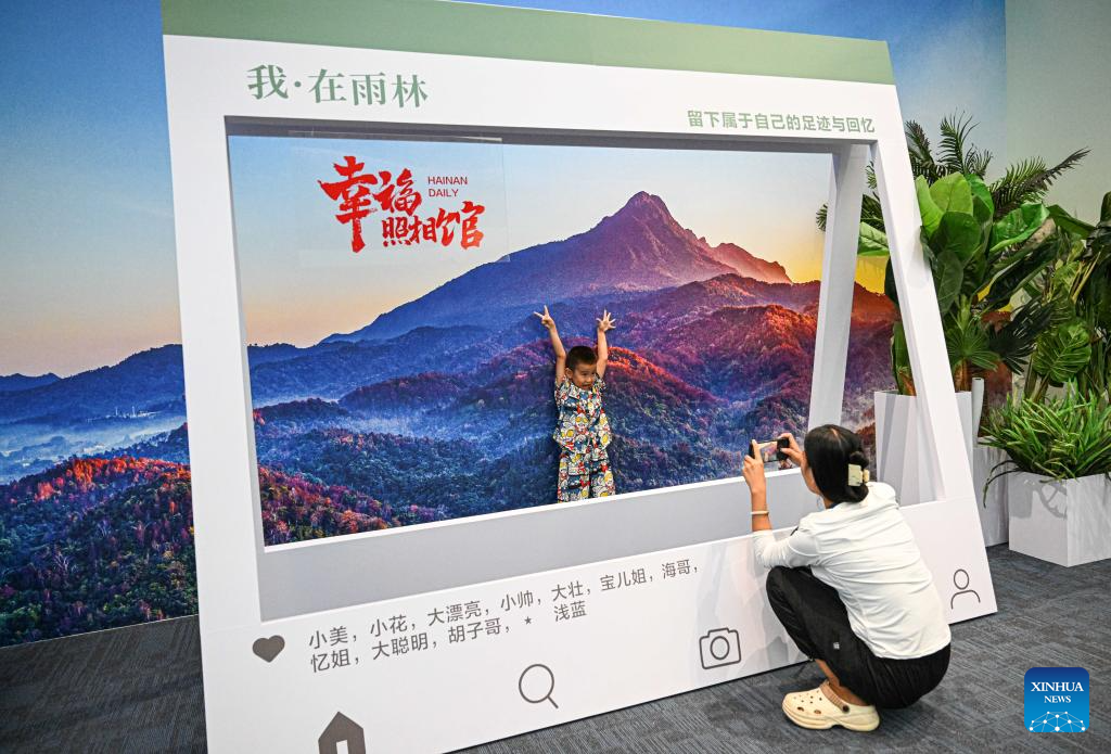 A visitor poses for a photo at the "Guarding Rainforest Homeland" exhibition in Haikou, south China's Hainan Province, Oct. 13, 2024. The "Guarding Rainforest Homeland" exhibition has been held by the management office of the National Park of Hainan Tropical Rainforest in Haikou. Featuring animal specimens, photographs and videos, the exhibition showcases the beauty of rainforest and introduces the construction process of the National Park of Hainan Tropical Rainforest. (Xinhua/Pu Xiaoxu)