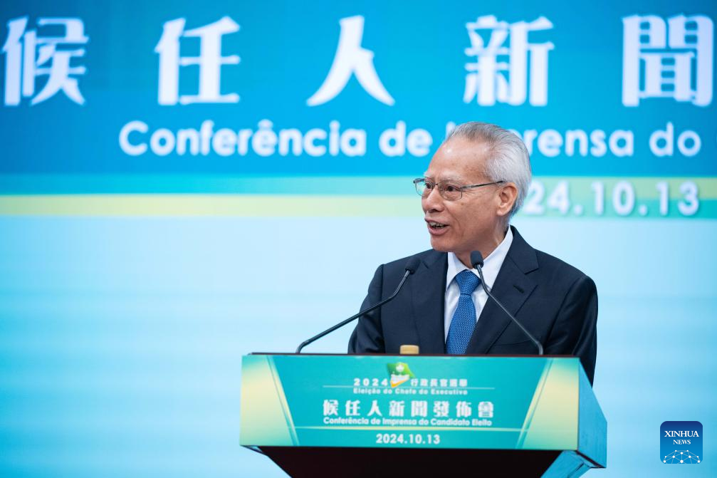 Sam Hou Fai, the sixth-term chief executive designate of China's Macao Special Administrative Region (SAR), attends a press conference in Macao, south China, Oct. 13, 2024. Sam Hou Fai was elected by an overwhelming majority as the sixth-term chief executive designate of China's Macao Special Administrative Region (SAR) on Sunday. Sam won the election with 394 votes in favor out of 398 valid ballots. (Xinhua/Chen Duo)