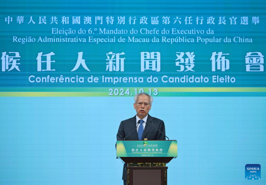 Sam Hou Fai, the sixth-term chief executive designate of China's Macao Special Administrative Region (SAR), attends a press conference in Macao, south China, Oct. 13, 2024. Sam Hou Fai was elected by an overwhelming majority as the sixth-term chief executive designate of China's Macao Special Administrative Region (SAR) on Sunday. Sam won the election with 394 votes in favor out of 398 valid ballots. (Xinhua/Cheong Kam Ka)