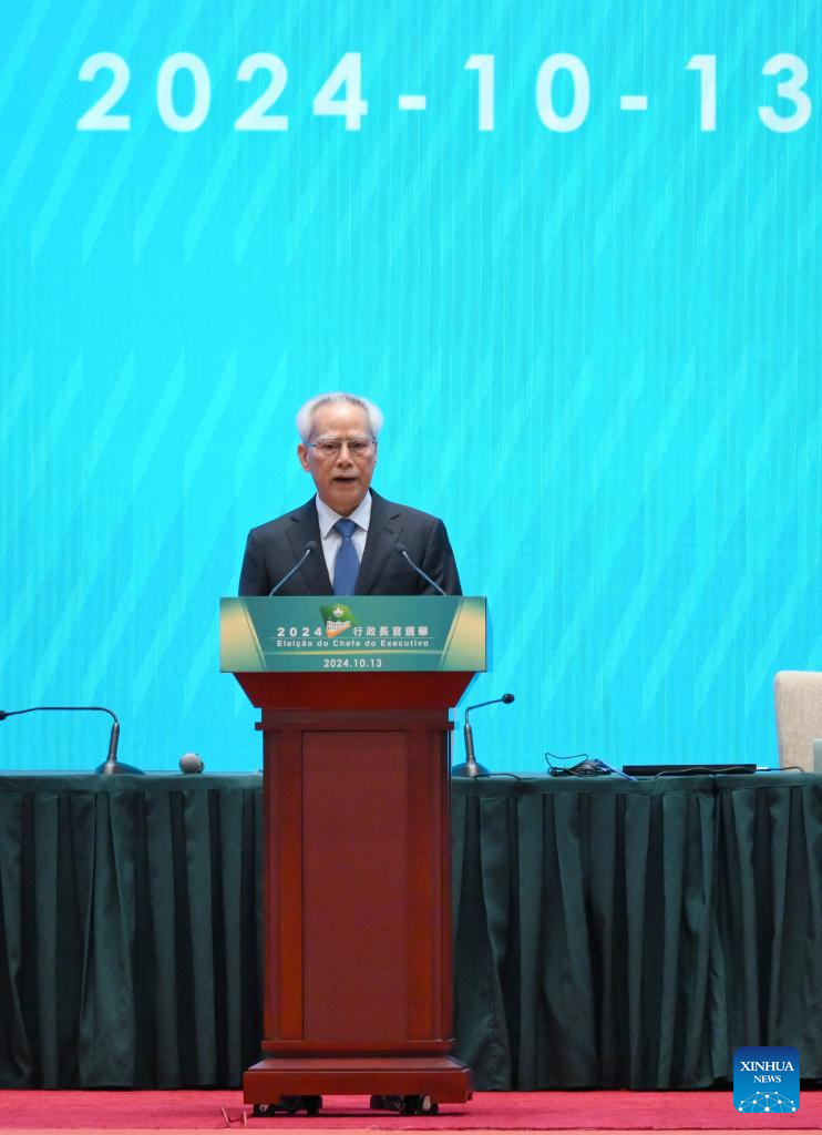 Sam Hou Fai, the sixth-term chief executive designate of China's Macao Special Administrative Region (SAR), is pictured during the election in Macao, south China, Oct. 13, 2024. Sam Hou Fai was elected by an overwhelming majority as the sixth-term chief executive designate of China's Macao Special Administrative Region (SAR) on Sunday. Sam won the election with 394 votes in favor out of 398 valid ballots. (Xinhua/Chen Duo)