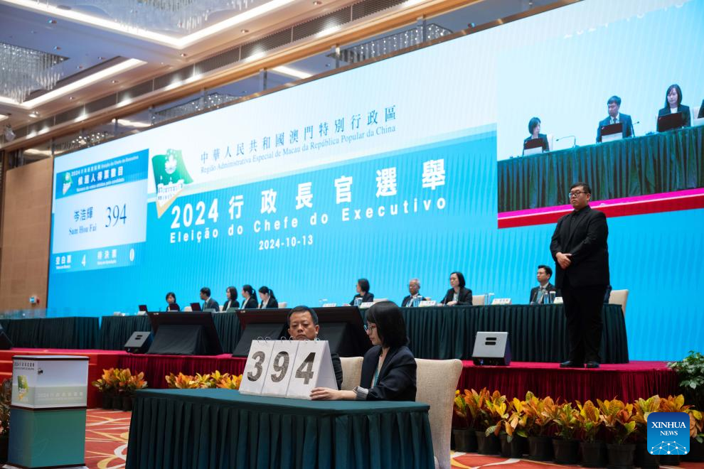 MACAO, Oct. 13 (Xinhua) -- Sam Hou Fai was elected by an overwhelming majority as the sixth-term chief executive designate of China's Macao Special Administrative Region (SAR) on Sunday.