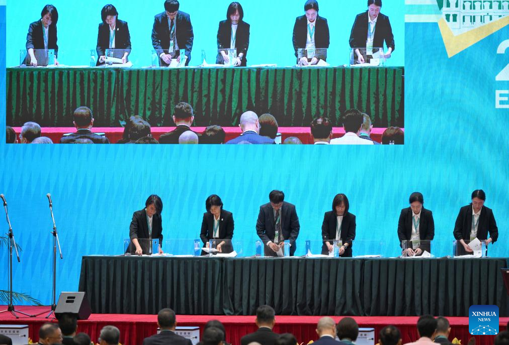 Staff members record the votes during the election in Macao, south China, Oct. 13, 2024. Sam Hou Fai was elected by an overwhelming majority as the sixth-term chief executive designate of China's Macao Special Administrative Region (SAR) on Sunday. Sam won the election with 394 votes in favor out of 398 valid ballots. (Xinhua/Cheong Kam Ka)