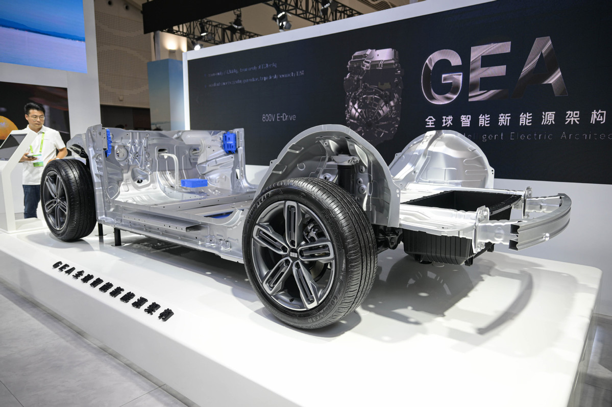This photo taken on Sept 28, 2024 shows a Global Intelligent Electric Architecture (GEA) at the booth of Geely during an exhibition featuring cutting-edge technologies and products of new energy vehicle (NEV) in Haikou, South China's Hainan province, Sept 28, 2024. [Photo/Xinhua]