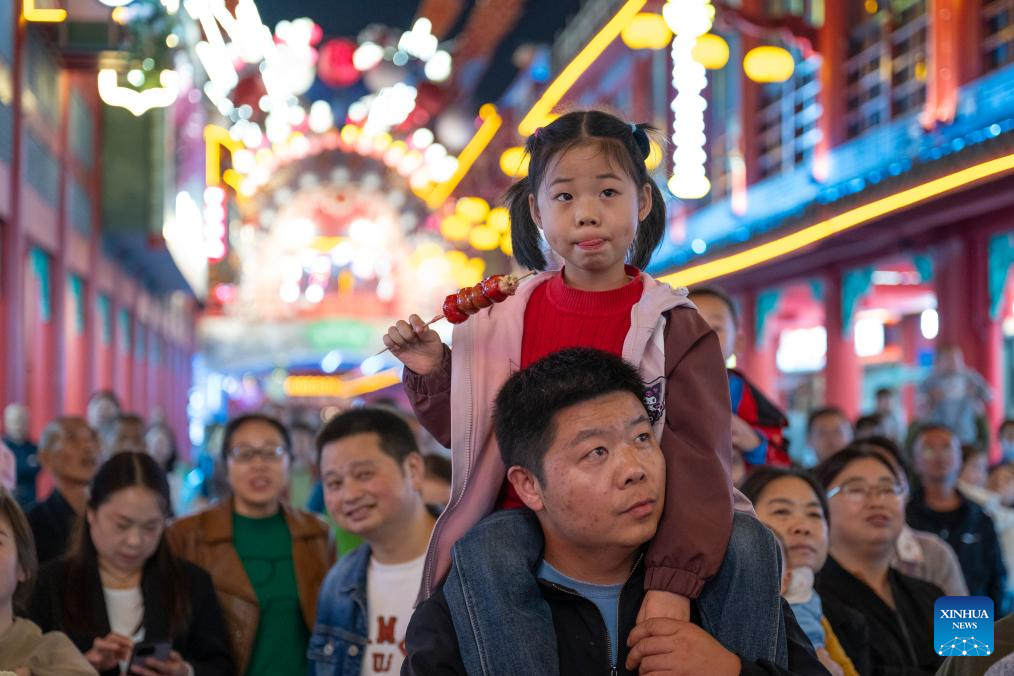 People watch a performance at a tourist attraction in Zhuxi County of Shiyan City, central China's Hubei Province, Oct. 12, 2024. (Xinhua/Wu Zhizun)