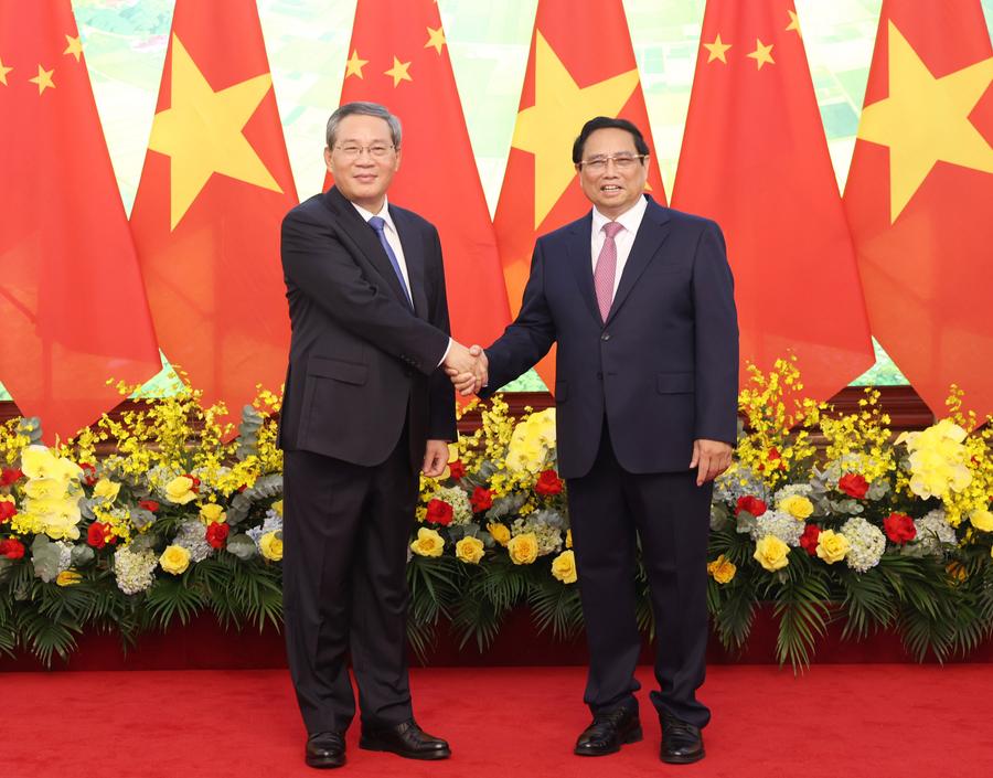 Chinese Premier Li Qiang holds talks with Vietnamese Prime Minister Pham Minh Chinh in Hanoi, Vietnam, Oct. 13, 2024. (Xinhua/Liu Weibing)