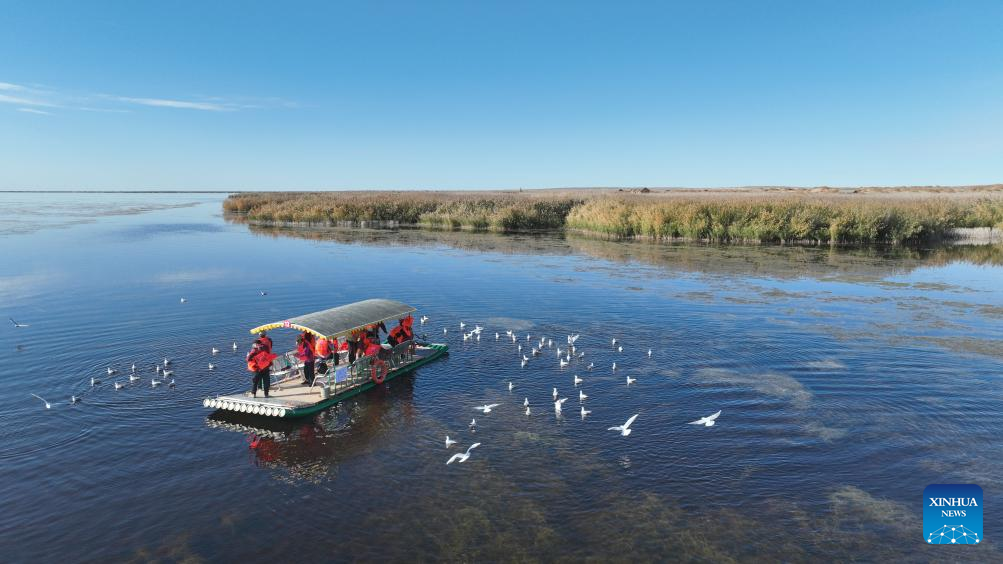 An aerial drone photo shows tourists taking a boat for sightseeing at the Juyanhai scenic spot in Ejina Banner of Alxa League, north China's Inner Mongolia Autonomous Region, Oct. 14, 2024. (Xinhua/Bei He)