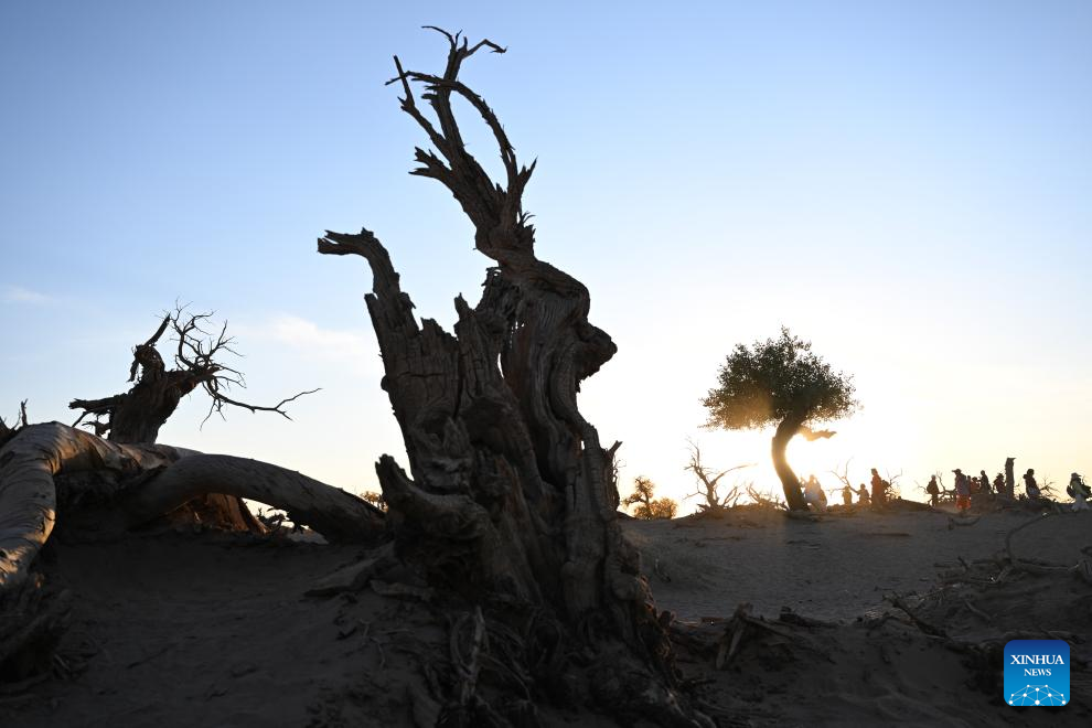 Tourists visit the Strange Forest scenic spot in Ejina Banner of Alxa League, north China's Inner Mongolia Autonomous Region, Oct. 14, 2024. (Xinhua/Liu Lianfen)