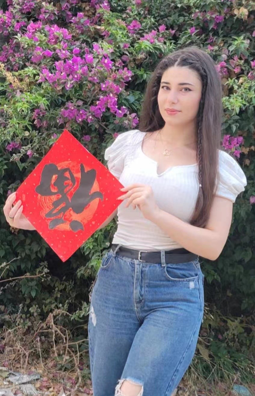 Rahaf Karhily poses for a picture with the Fu character given by her Chinese friend. (Photo provided to People's Daily)