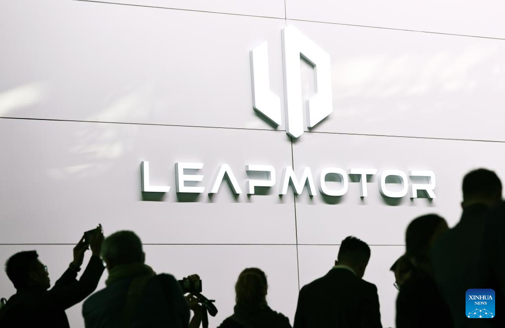 People visit the pavilion of Chinese carmaker Leapmotor at the 2024 Paris Motor Show during the media day in Paris, France, Oct. 14, 2024. (Xinhua/Gao Jing)