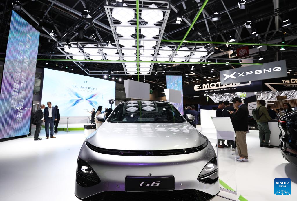 People visit the pavilion of Chinese carmaker Xpeng at the 2024 Paris Motor Show during the media day in Paris, France, Oct. 14, 2024. (Xinhua/Gao Jing)