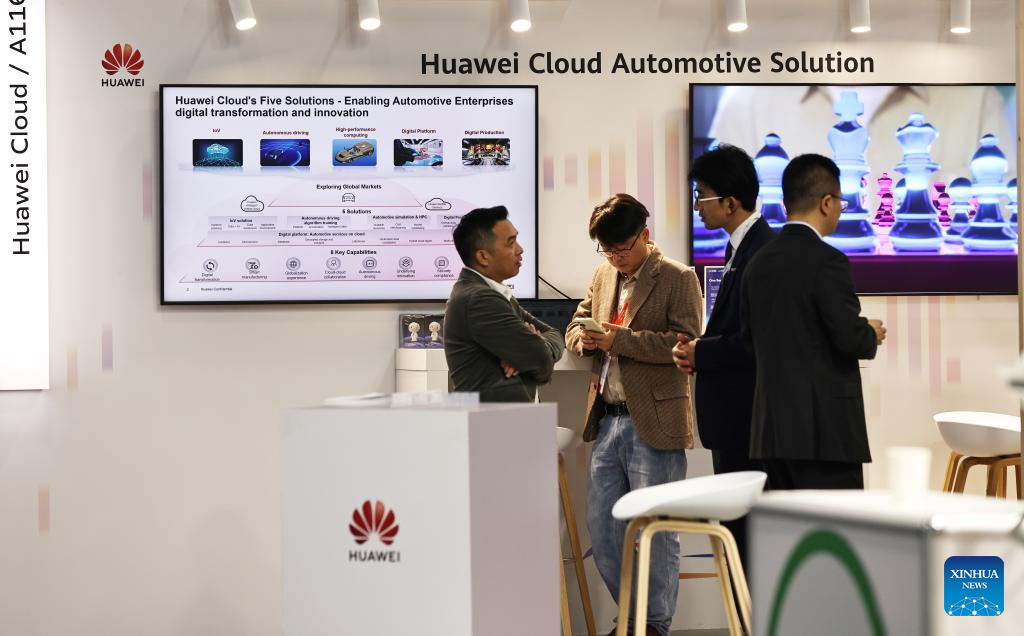 People visit the pavilion of Huawei Cloud at the 2024 Paris Motor Show during the media day in Paris, France, Oct. 14, 2024. (Xinhua/Gao Jing)