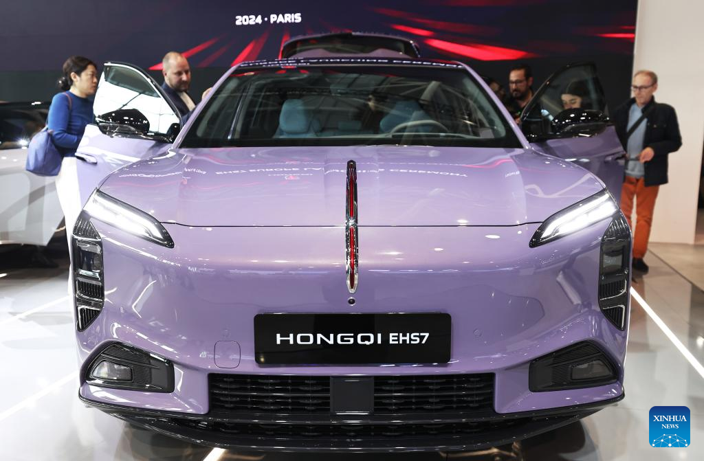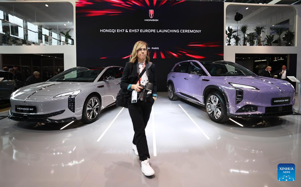 People visit the pavilion of Chinese carmaker FAW-Hongqi at the 2024 Paris Motor Show during the media day in Paris, France, Oct. 14, 2024. (Xinhua/Gao Jing)