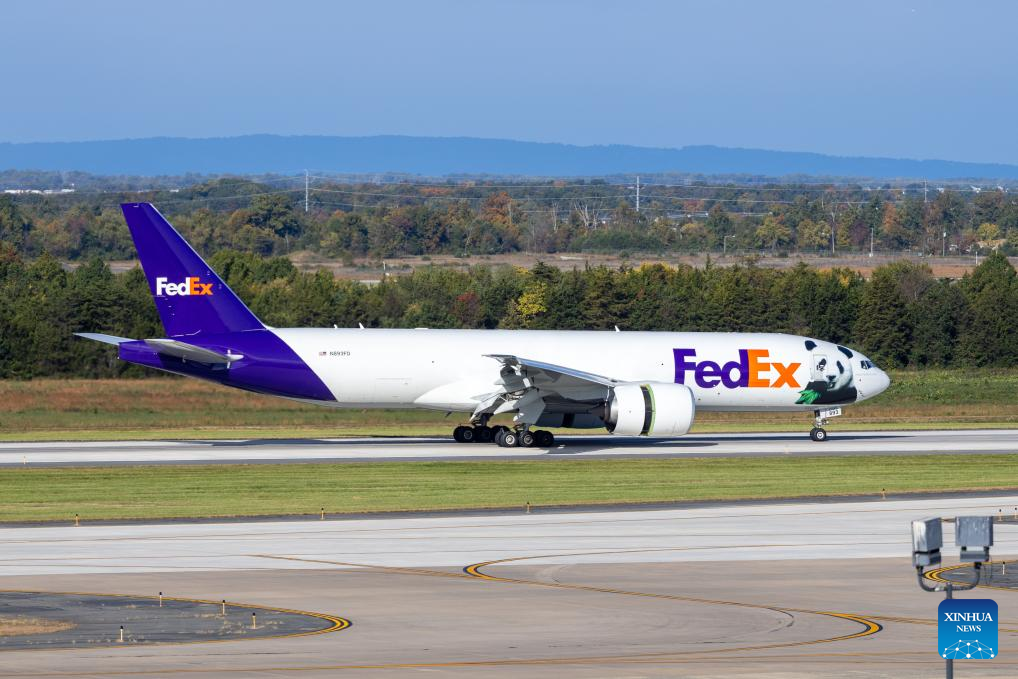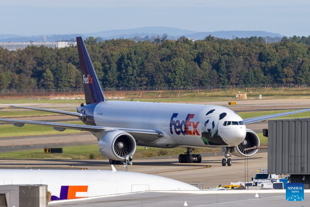 An airplane transporting giant pandas arrives at the Dulles International Airport near Washington, D.C., the United States, on Oct. 15, 2024. A pair of giant pandas, Bao Li and Qing Bao, arrived at Washington, D.C. on Tuesday, after an approximately 19-hour trans-Pacific trip from Sichuan Province in southwest China. A dedicated "FedEx Panda Express" Boeing 777F aircraft landed at the Dulles International Airport near Washington, D.C. at around 10:00 a.m. local time (1400 GMT). (Xinhua/Hu Yousong)