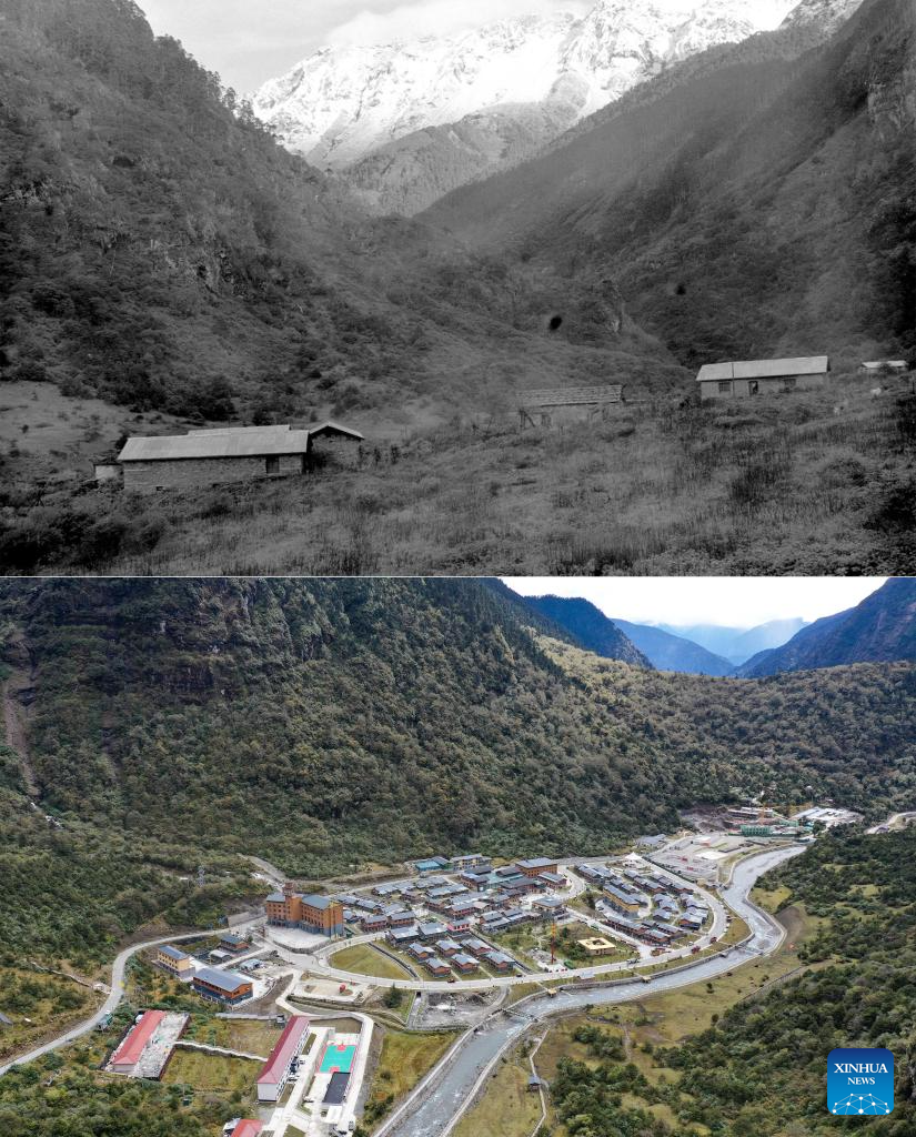 This combo photo shows a view of Yumai Township in Shannan City, southwest China's Xizang Autonomous Region on Oct. 26, 2003 (above, photo by Xinhua photographer Sonam Norbu), and the view here on Oct. 14, 2024 (photo by Xinhua photographer Ding Ting). (Xinhua)?