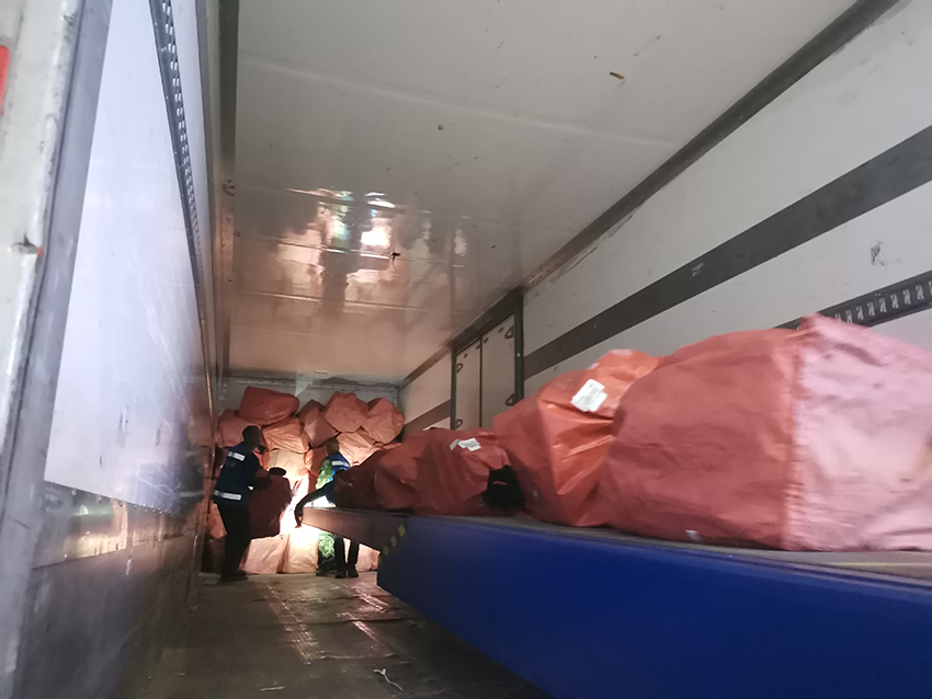 Goods are transported using conveyor belts. (Photo courtesy of Kunming branch of China Railway Express Co., Ltd.)