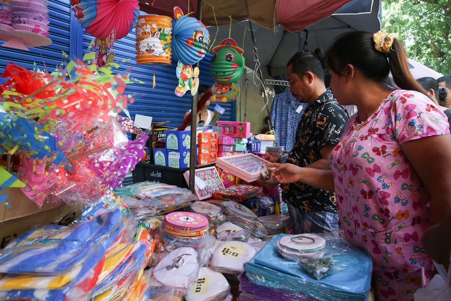 People buy Thadingyut festival decorations at a market in Yangon, Myanmar, Oct. 14, 2024. (Xinhua/Myo Kyaw Soe)