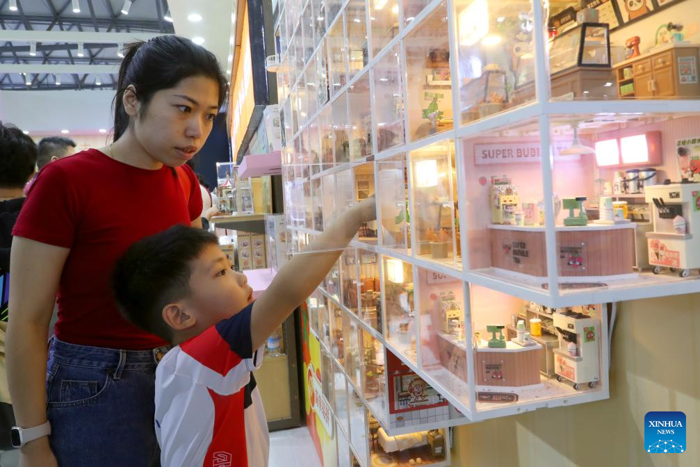 Visitors look at miniatures displayed during the 2024 China Toy Expo in east China's Shanghai, Oct. 16, 2024. The three-day 2024 China Toy Expo kicked off at Shanghai New International Expo Centre Wednesday, attracting more than 2,500 companies of the toy industry from home and abroad. (Xinhua/Fang Zhe)