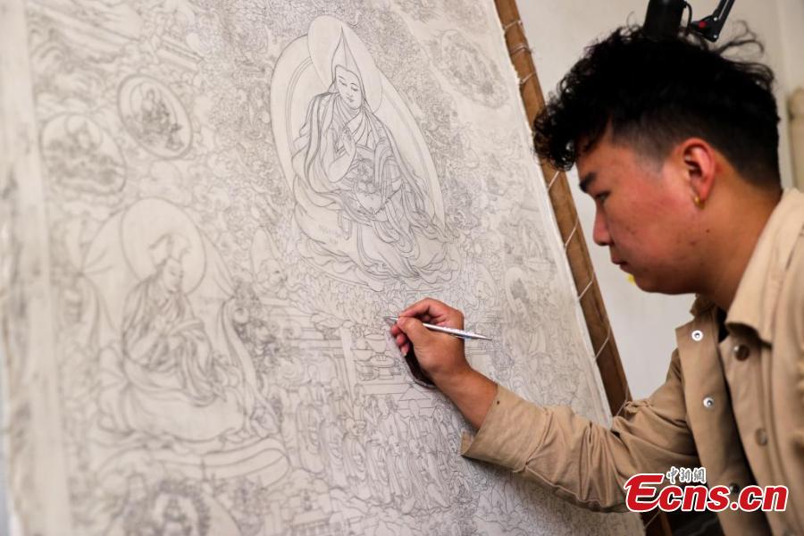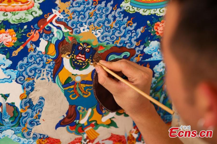 An artist creates a Thangka painting at the Renjun Painting Academy in Tongren, Huangnan Tibetan Autonomous Prefecture, Oct. 16, 2024. (Photo: China News Service/Xue Di)