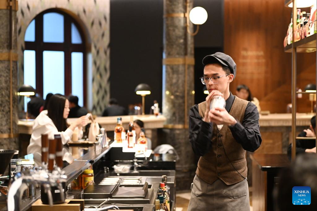 A barista makes coffee drink at a Starbucks in the Golden Street commercial area in north China's Tianjin, Oct. 13, 2024. (Xinhua/Li Ran)