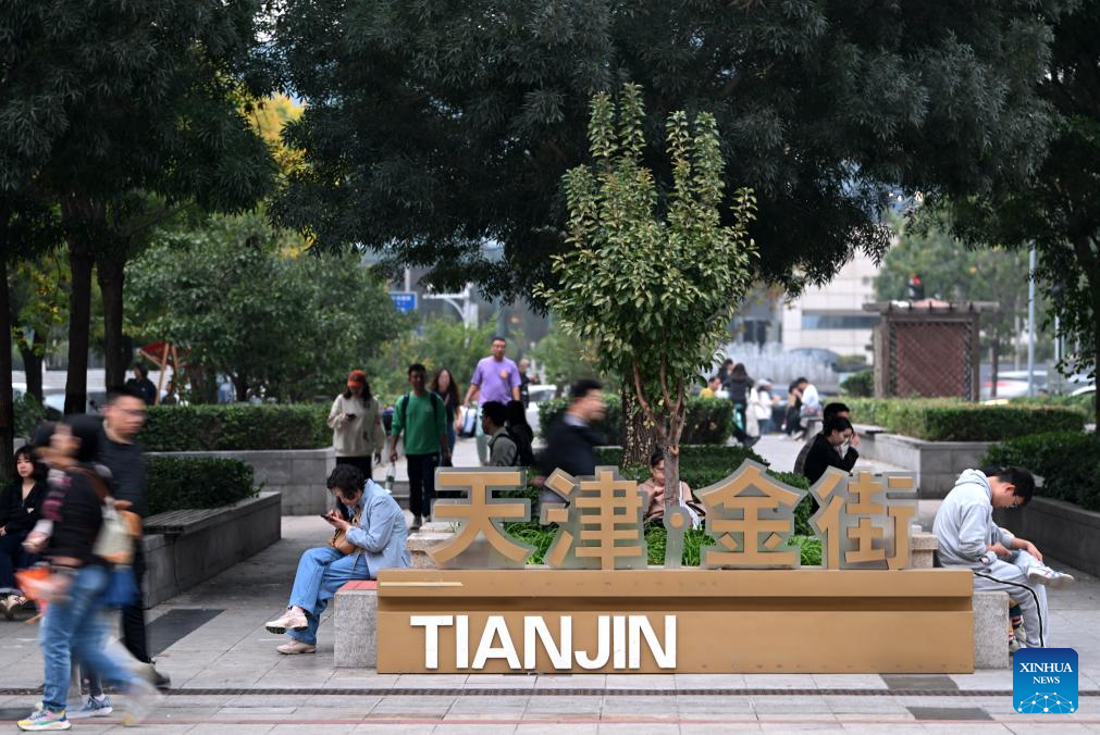 Tourists take a rest in the Golden Street commercial area in north China's Tianjin, Oct. 13, 2024. The Golden Street, a centennial commercial area centering on the crossing of Binjiang Road and Heping Road in Tianjin, is dubbed the cradle of modern business civilization in this municipality. It has gained popularity among citizens and tourists thanks to government-driven renewal and upgrading efforts. (Xinhua/Li Ran)