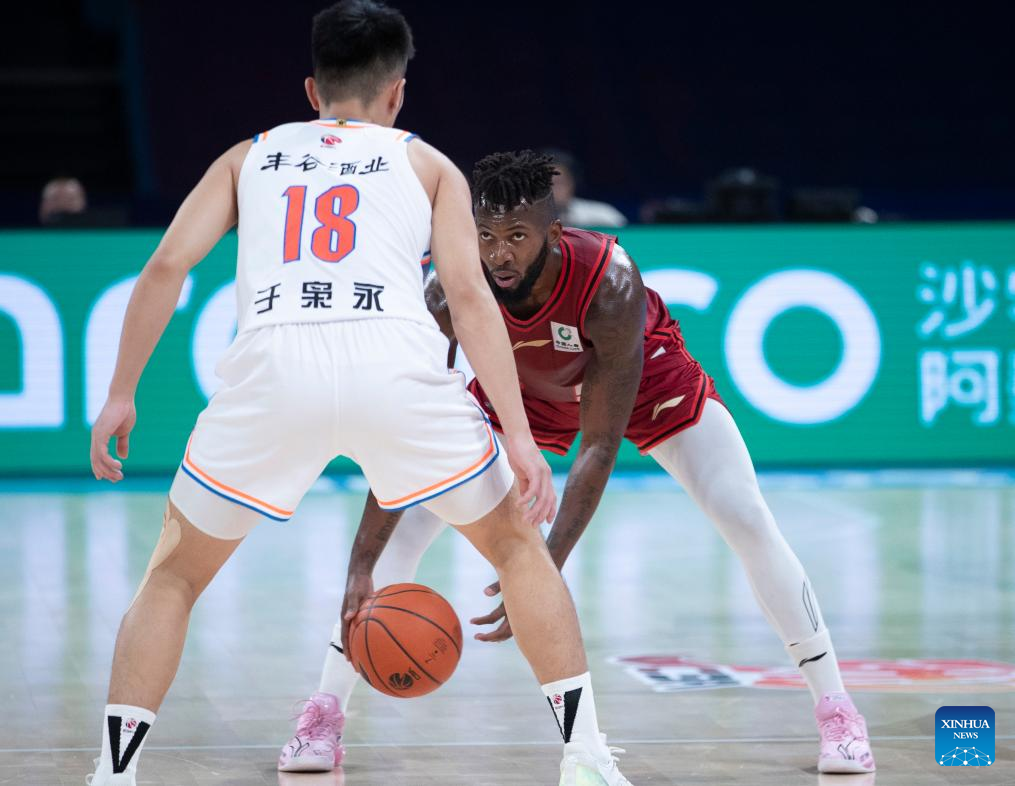 Marquese Chriss (L) of Shandong Heroes goes for a basket during a match between Zhejiang Lions and Shandong Heroes at the 2024-2025 season of the Chinese Basketball Association (CBA) league in Hangzhou, east China's Zhejiang Province, Oct. 17, 2024. (Xinhua/Jiang Han)