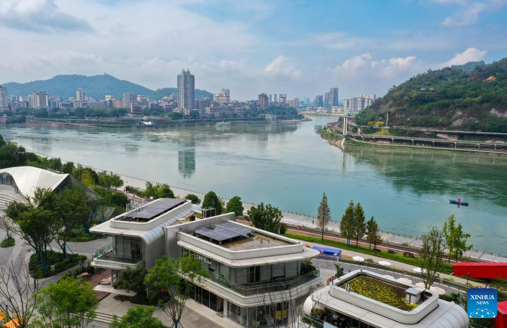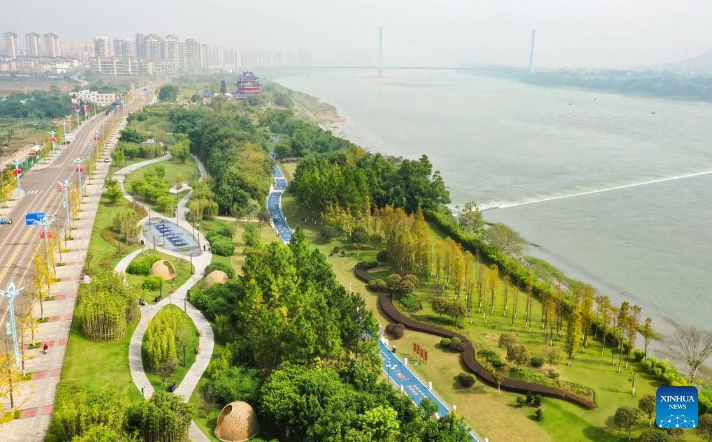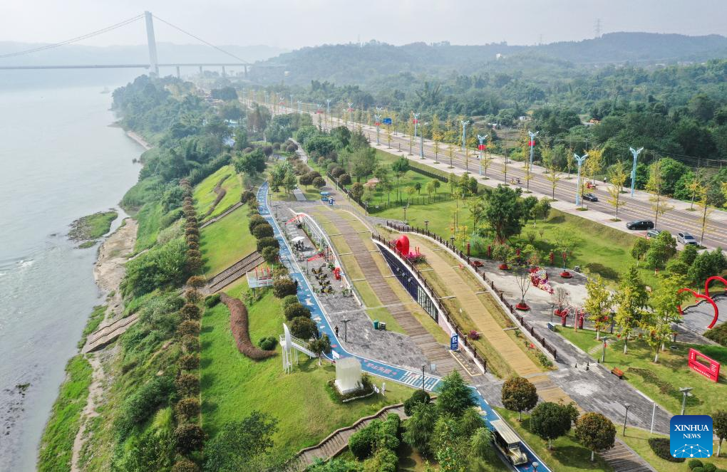 A drone photo taken on Oct. 14, 2024 shows a greenway at the Nanxi riverside wetland park in Yibin City, southwest China's Sichuan Province. The city of Yibin is an important ecological shelter and water source conservation base on the upper reaches of the Yangtze River. The Yangtze River, Jinsha River, and Minjiang River meet in the downtown area of Yibin.