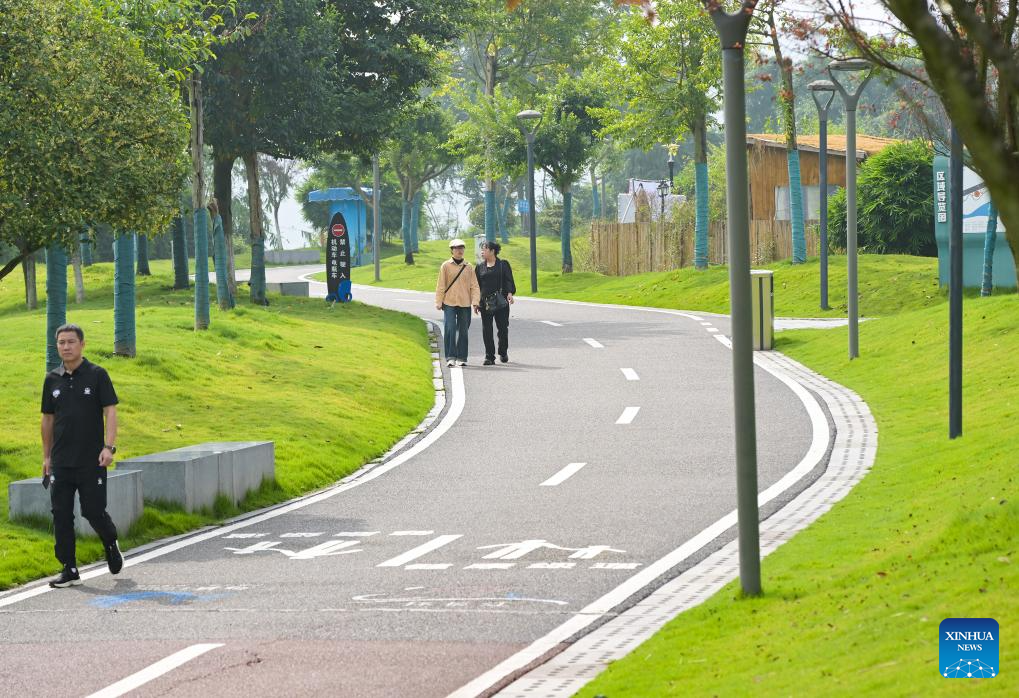 People walk on a greenway at the Nanxi riverside wetland park in Yibin City, southwest China's Sichuan Province, Oct. 14, 2024. The city of Yibin is an important ecological shelter and water source conservation base on the upper reaches of the Yangtze River. The Yangtze River, Jinsha River, and Minjiang River meet in the downtown area of Yibin.