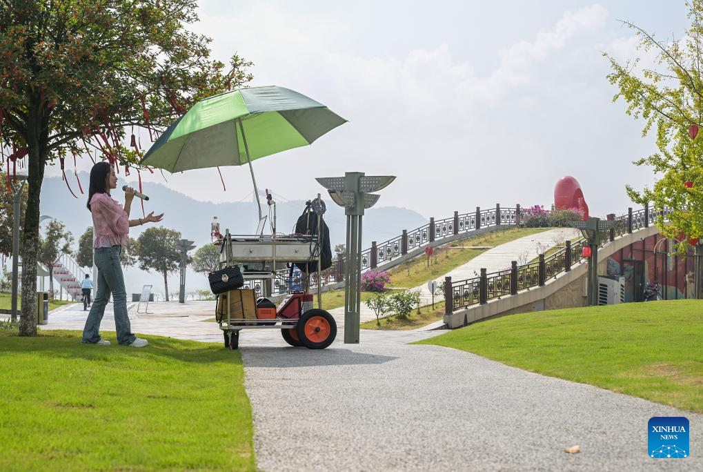 A host goes on live broadcast at the Nanxi riverside wetland park in Yibin City, southwest China's Sichuan Province, Oct. 14, 2024. The city of Yibin is an important ecological shelter and water source conservation base on the upper reaches of the Yangtze River. The Yangtze River, Jinsha River, and Minjiang River meet in the downtown area of Yibin.