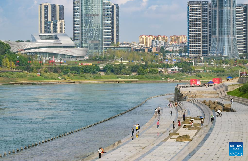 People walk on a bank road of the Sanjiangkou Yangtze River Park in Yibin City, southwest China's Sichuan Province, Oct. 13, 2024. The city of Yibin is an important ecological shelter and water source conservation base on the upper reaches of the Yangtze River. The Yangtze River, Jinsha River, and Minjiang River meet in the downtown area of Yibin.