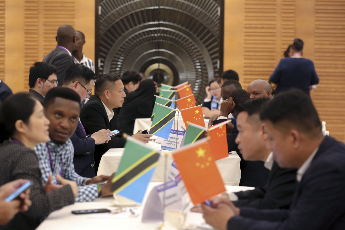Chinese investors (right) communicate with Tanzanian business representatives during the China Tanzania Investment Forum Zhejiang (Jinhua)-Tanzania Trade and Investment Conference in Dar es Salaam, Tanzania, on March 27. (Photo/XINHUA)