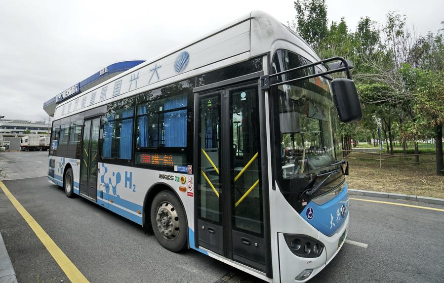 A hydrogen-powered bus runs on a road in Daxing Distrcit of Beijing, capital of China, Aug. 20, 2024. (Xinhua/Li Xin)