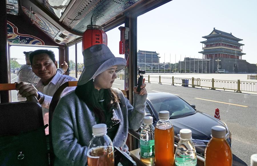 Tourists ride in a refurbished antique bus called "dang dang che" during a sightseeing tour along the Central Axis in Beijing, capital of China, Oct. 15, 2024. (Xinhua/Li Xin)
