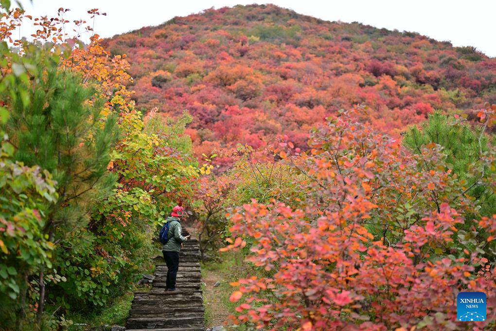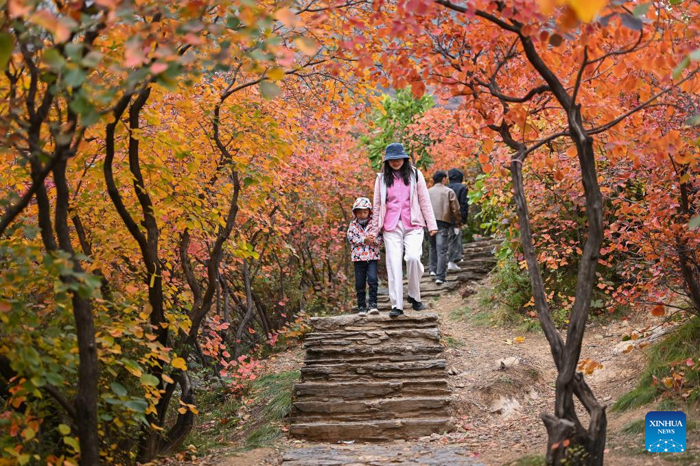 People enjoy the autumn scenery at Pofengling Scenic Area in Fangshan District of Beijing, Oct. 20, 2024. (Xinhua/Li Xin)